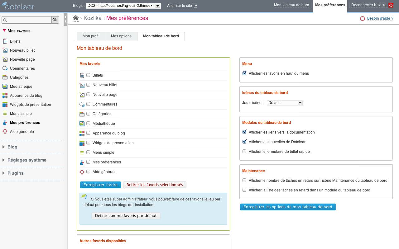 The Categories page offers a great segue (what a fantastic coincidence!) towards our next topic: personalization. The first steps towards personalization had been made in Dotclear 2.4 when we introduced favorites. We're continuing down that path. The My preferences page allows you to deactivate drag'n drop across the whole console—without deactivating all javascript features, or to deactivate multiple file upload in the media manager. There you'll also find knobs to configure the dashboard, such as your choice of favorites and modules.